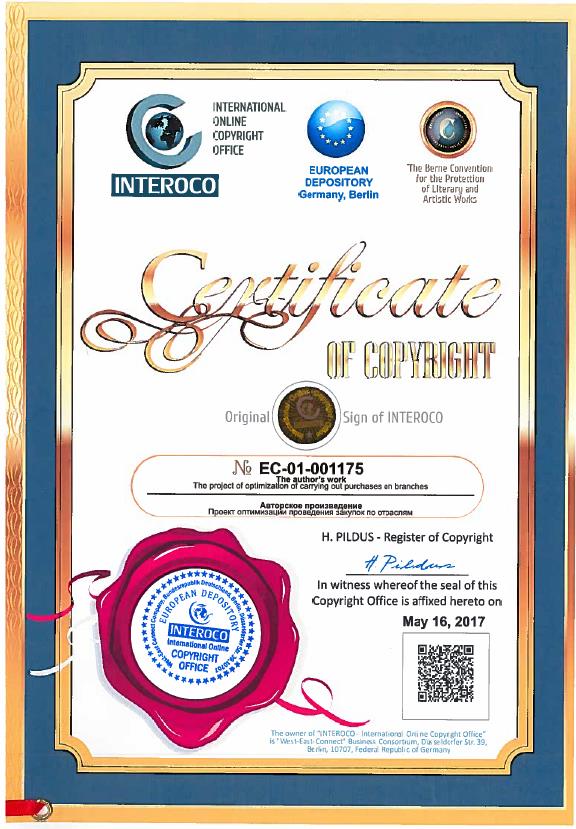 Нами так же защищено метод оптимизации закупок/снабжение как форма решение международного авторского право. Защита авторских прав является одной из самых сложных и распространенных категорий споров, однако анализ имеющихся в сети интернет инструментов фиксации и защиты авторских прав свидетельствует о широком числе злоупотреблений ...